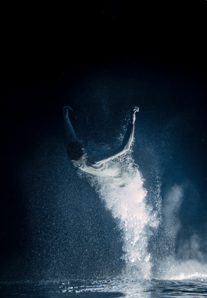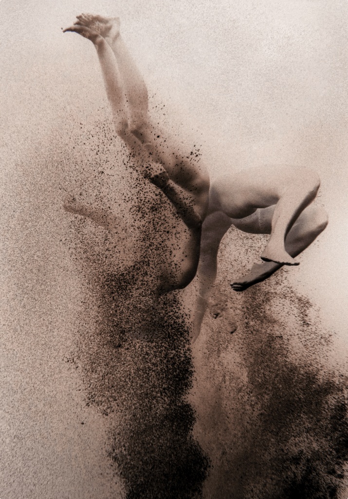 Die Werkgruppe „Accidit| Die Natur macht keine Sprünge“ ist eine Foto- und Videoarbeit. Während die Videoarbeit zeigt, wie Menschen in einer raumlosen Um- gebung in die Erde gesogen werden, ergibt sich bei der Fotoarbeit der Eindruck, sie würden aus der Erde emporschnellen. Die Videoarbeit birgt die Anmutung einer Animation, die Fotografie wirkt eher skulptural. Es entstehen kontrastierende Eindrücke auf Grundlage derselben Ausgangslage. Ähnlich verhält es sich mit dem Material selbst. Die Invertierung verkehrt Schwarz zu Weiß, Wasser wird zu Erde, oben wird zu unten. Das rückwärts gespielte Material des Films setzt den Anfang zum Ende und andersrum.